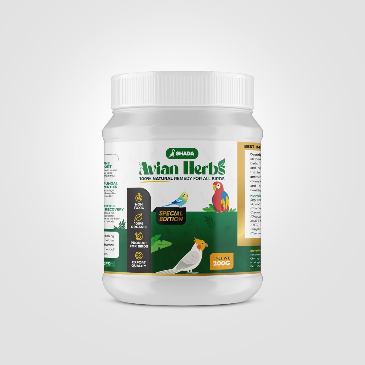 এভিয়ান হারব (Avian Herb) পাখির সার্বিক স্বাস্থ্য রক্ষায় একটি কার্যকর হারবাল ফর্মুলা। এতে রয়েছে নির্বাচিত প্রাকৃতিক ভেষজ উপাদান, যা পাখির শরীরকে ভিতর থেকে সুস্থ রাখে এবং দৈনন্দিন পুষ্টির ঘাটতি পূরণে সহায়তা করে।
